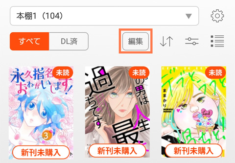 「本棚」の「編集」をタップすると選択中の本棚内作品の編集ができます。