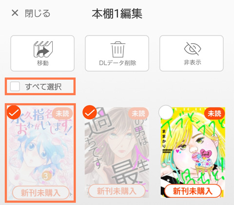 「すべて選択」にチェックを入れると、選択中の本棚内の作品すべてにチェックがつきます。