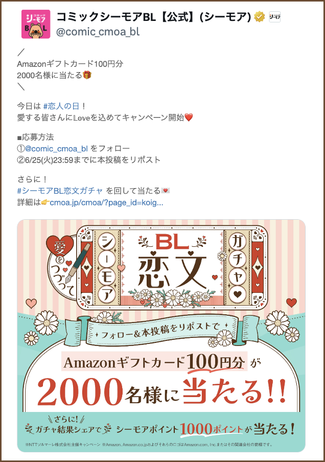 期間中にコミックシーモアBL【公式】(シーモア)(@comic_cmoa_bl)をフォローして、コミックシーモアBL【公式】(シーモア)Xアカウントから投稿されたハッシュタグ「#シーモアBL恋文ガチャ」がついたリポスト対象投稿を、キャンペーン期間中にリポストしていただいた方の中から抽選で2,000名様に、「Amazonギフトカード100円分」をプレゼントします。