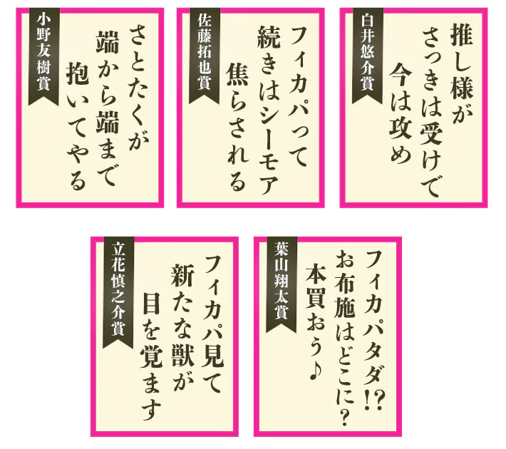 小野「第三回を迎えたフィカスパーティー、これからもきっと続いていくことでしょう…というか発表されたので続いていきます!ぜひ引き続きの応援と葉山くんが選んでくれた川柳の『お布施しよ』の通り本を読んでいただけるとまた皆さんとお会いできるかなと思いますので、ご愛顧のほど宜しくお願いします!」