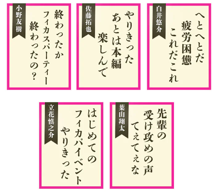 小野「今日はMCも務めさせていただきありがとうございました。二大会連続出演という事で(白井さん「大会だっけ???」)、はい、選手宣誓!という形で出させていただいたんですけれども、ゆうすけが言った通り『これこれ!』と言う感じがフィカスパーティーの良さですね。しかも4thも決まっていると!スケジュールの方を早めにいただければと思いますけれども!『また参加したいな~~』っていう思いがすごくあるイベントなので、皆さんもぜひお会いできればなと思います。