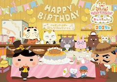 「いいおしりの日 2025 ビジュアル」に描かれたのは、カフェ・ラッキーキャットに集まり、おしりたんていの誕生日をみんなでお祝いする様子。中央の誕生日ケーキはブラウンとマルチーズしょちょうが注文し、マスターがおしりたんていの大好物・スイートポテトを使って作ったものだ。常連客のおおやちあき、カシマッセまさみ、みずべみはる、そしておしりたんていの父・おしりダンディまで勢揃いした。