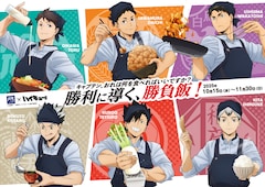 コラボメニューは作中に登場する各校の特徴に合わせた6品。10月15日から11月5日まで烏野高校「瞬発力ブースト飯」、青葉城西高校「相乗効果バランス飯」、白鳥沢学園高校「パワーチャージ飯」、11月6日から30日まで音駒高校「ラリーを繋ぐスタミナ飯」、梟谷学園高校「試合前のコンディション飯」、稲荷崎高校「集中力全開ゾーン飯」が販売される。コラボメニューの価格はすべて税込1880円。1品注文ごとに限定描き下ろしビジュアルボードがランダムで1枚もらえる。ビジュアルボードには烏野の澤村大地、青城の及川徹、音駒の黒尾鉄朗、白鳥沢の牛島若利、梟谷の木兎光太郎、稲荷崎の北信介がデザインされた。またオリジナルボトル付きソフトドリンクも用意。価格は税込1200円だ。