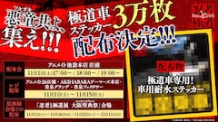 殺島が帝都高速道路に集めた極道車の数と同じ“3万”枚のステッカー。11月1日に東京・アニメイト池袋本店の店頭で配布会が行われ、11月1日から15日にかけてアニメイト各店舗、AKIHABARAゲーマーズ本店、書泉グランデ、書泉ブックタワーのレジで配布される。また大阪・ベアトラップギャラリーで開催中の原画展「忍者と極道展 大阪聖典祭(ナニワバイブルズ)」でも、11月1日から16日まで、11月22日から12月14日までの期間中に配布。ステッカーのデザインは後日公開される。