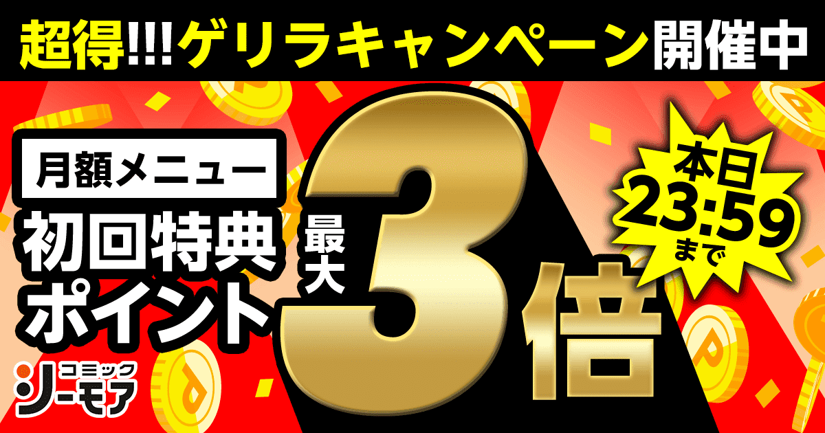 12時間限定の月額初回特典全メニュー2倍(クレジット決済の場合は初回特典3倍)ゲリラキャンペーンです。さらに、翌月まで月額メニュー登録を継続した方に1冊20%OFFクーポンをプレゼントいたします。