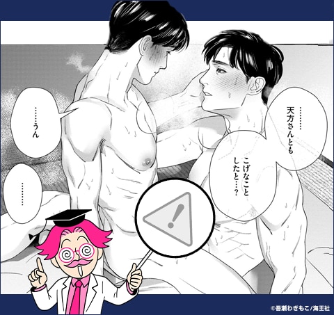 唐突に訪れた2人の初めて。男同士はどうしたらいいのかと聞く土岐に、鵜飼は準備していないから太腿を使ってほしいとお互いに香油をたらして本番ごっこの手ほどきをします。挿れられないもどかしさが逆にえちぃ!